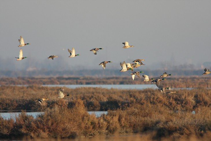 | Un tipico volo di Germani reali in laguna di Venezia. |
