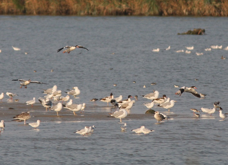 | Alcune Volpoche (tre in volo) con Gabbiani reali mediterranei, Gabbiani