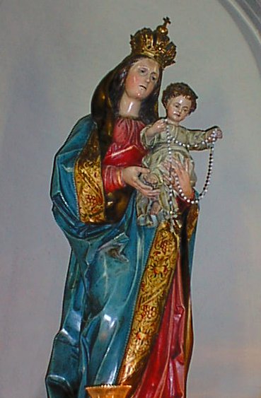Tre immagini della Madonna del Rosario col Bambino, statua devozionale in legno dipinto - sec. XVIII
